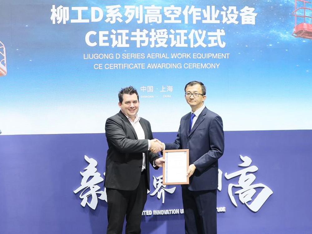 TUV SUD 大中华区工业部总监Mr Simon Lemin(左)向安徽柳工高空作业设备分公司总经理刘国强颁发CE认证