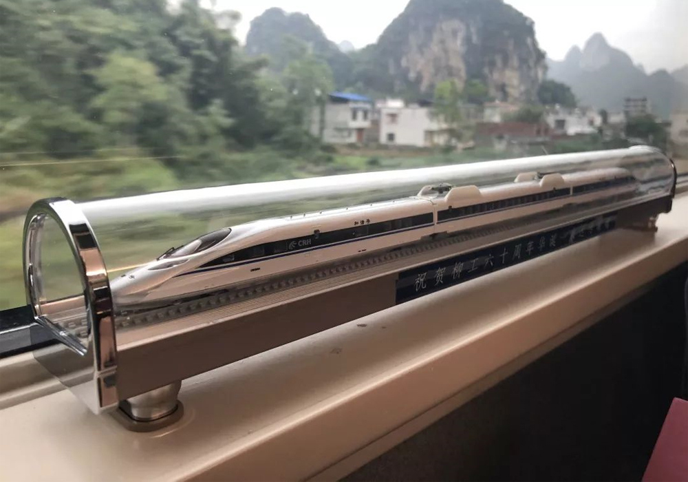 当柳工冠名的高铁列车模型被转交到工作人员手中时,这也标志着稳重的的柳工蓝,将与飞驰的列车一起,每天往返昆明于北京、上海之间,绽放在千里高铁线上。将“柳工智造”的名片传向四面八方。