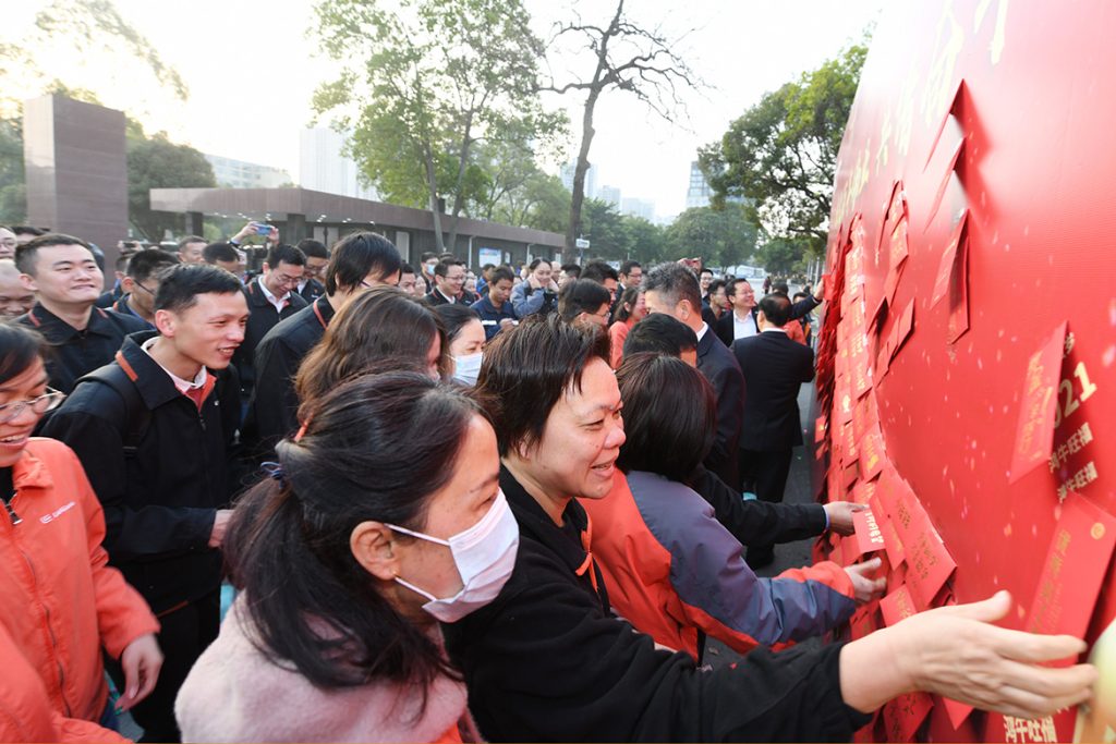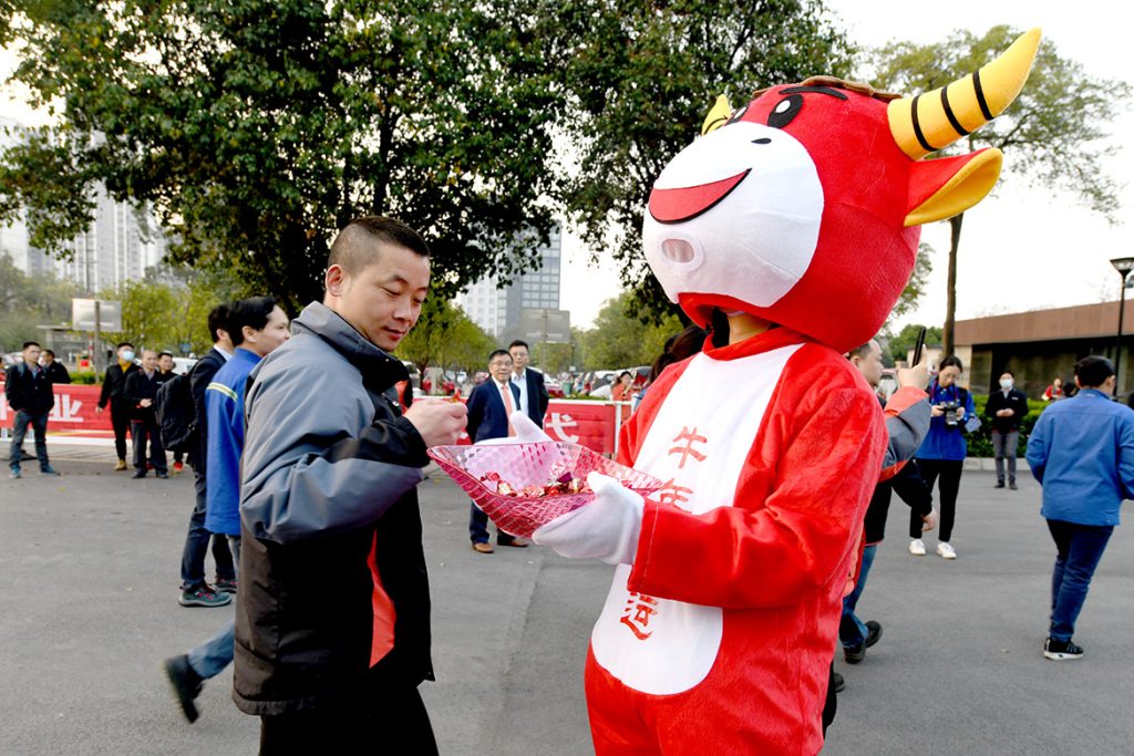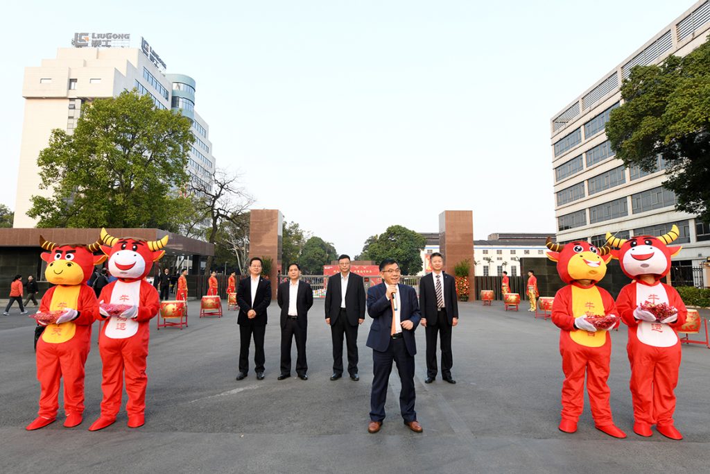 柳工领导曾光安、赖颂平、黄海波、李于宁、文武早早来到门口,与前来上班的员工互道新春祝福,大家脸上洋溢着灿烂的笑容,满怀激情,以“起步就要提速,开局就要争先”的精气神,“犇”向新目标、新高峰,以“十四五”开局之年的优秀业绩献礼中国共产党百年伟业。