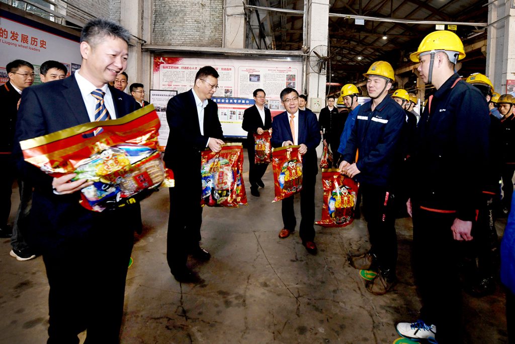 “祝大家新年快乐,工作愉快,家庭幸福!”在生产一线,柳工有限、柳工股份党委书记、董事长曾光安一行每到一处,便向大家送上新春祝福,充分肯定了大家在2020年付出的努力和取得的成就,勉励大家在新的一年勤劳勇敢,智慧创新,争创世界一流,同时扎实做好安全生产工作。