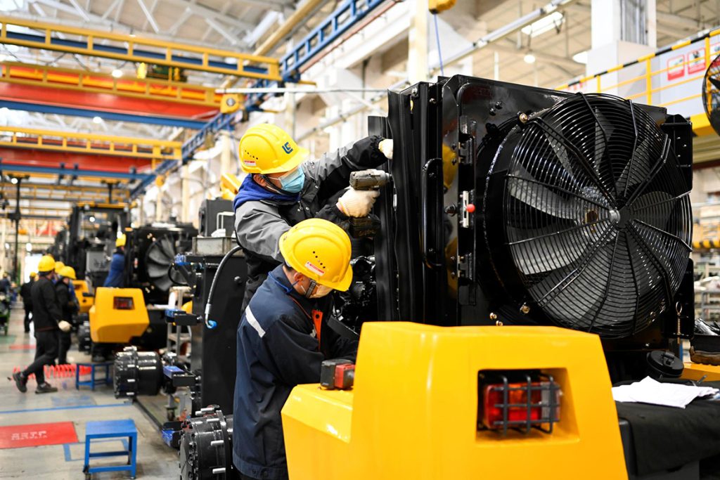 在柳工装载机、挖掘机生产一线,机器轰鸣,热火朝天,工人们为满足市场订单需求大干快上,海外产品产销两旺,持续保持良好态势。