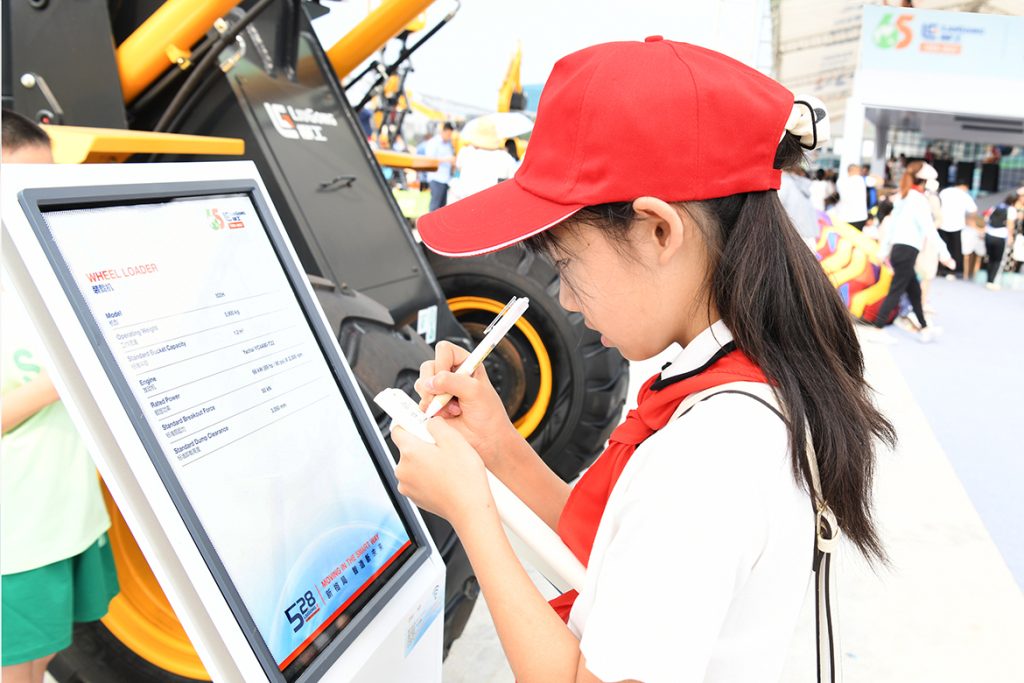 烈日炎炎,挡不住萌娃们探索的脚步,他们走进活动现场产品静态展示区,高端化、智能化、绿色化的柳工全系列工程机械产品引发了孩子们一连串的问题。